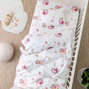 Σετ σεντόνια κούνιας με μαξιλαροθήκη από ύφασμα μερσεριζέ, 160 κλωστών, 100% βαμβακερό, εμπριμέ, σε λευκό φόντο, χρώμα ροζ, σχέδιο ονειροπόλος.