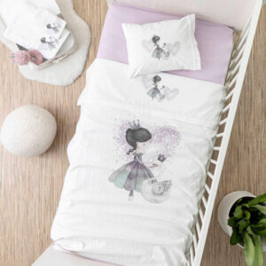 Σετ σεντόνια κούνιας με μαξιλαροθήκη από ύφασμα μερσεριζέ, 160 κλωστών, 100% βαμβακερό, μονόχρωμο, σε χρώμα λευκό, με διακοσμητική δαντέλα και ψηφιακή εκτύπωση στο πανωσέντονο και στη μαξιλαροθήκη, σχέδιο πριγκίπισσα.