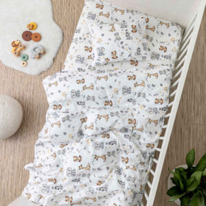 Σετ σεντόνια κούνιας με μαξιλαροθήκη από ύφασμα μερσεριζέ, 160 κλωστών, 100% βαμβακερό, εμπριμέ, σε λευκό φόντο, χρώμα γκρι, σχέδιο ζώα της ζούγκλας.