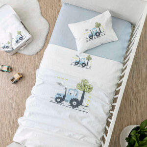 Σετ σεντόνια κούνιας με μαξιλαροθήκη από ύφασμα μερσεριζέ, 160 κλωστών, 100% βαμβακερό, μονόχρωμο, σε χρώμα λευκό, με ψηφιακή εκτύπωση στο πανωσέντονο και στη μαξιλαροθήκη, σχέδιο τρακτέρ.