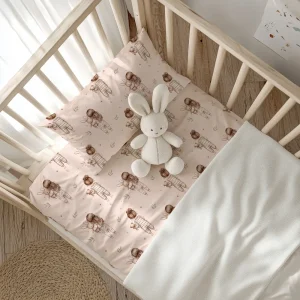 Σετ σεντόνια κούνιας με μαξιλαροθήκη από ύφασμα μερσεριζέ, 160 κλωστών, 100% βαμβακερό, εμπριμέ, χρώμα ροζέ, σχέδιο με παιδάκια με βρεφικές πιτζάμες.Διατίθεται σε 2 χρώματα.
