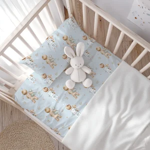 Σετ σεντόνια κούνιας με μαξιλαροθήκη από ύφασμα μερσεριζέ, 160 κλωστών, 100% βαμβακερό, εμπριμέ, χρώμα σιέλ, σχέδιο με παιδάκια με βρεφικές πιτζάμες.Διατίθεται σε 2 χρώματα.