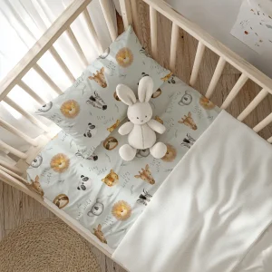 Σετ σεντόνια κούνιας με μαξιλαροθήκη από ύφασμα μερσεριζέ, 160 κλωστών, 100% βαμβακερό, εμπριμέ, χρώμα φυστικί, σχέδιο ζώα της ζούγκλας.