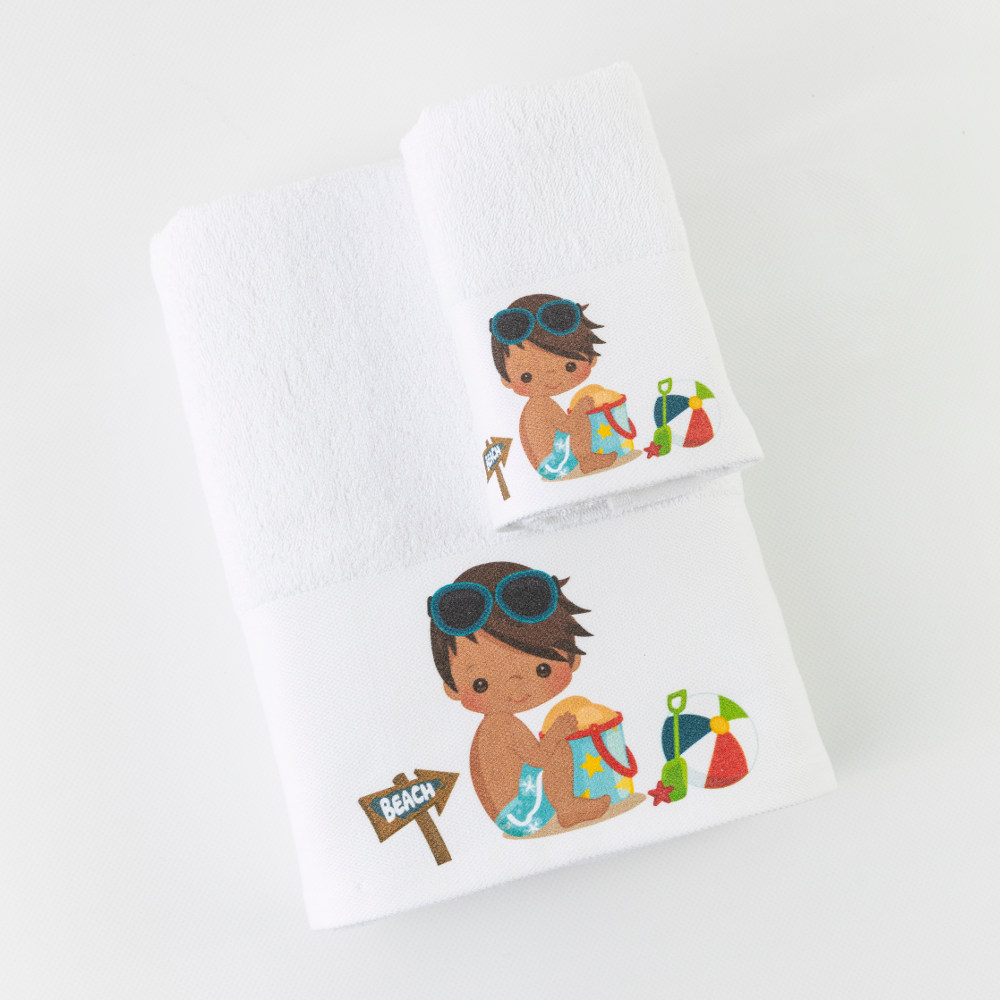 Σετ πετσέτες 2 τεμαχίων, μπάνιου και χειρός, από ύφασμα φροτέ πενιέ, 100% βαμβακερό, μονόχρωμο, λευκό, με ψηφιακή εκτύπωση, σχέδιο beach boy.Διατίθεται σε 2 χρώματα.