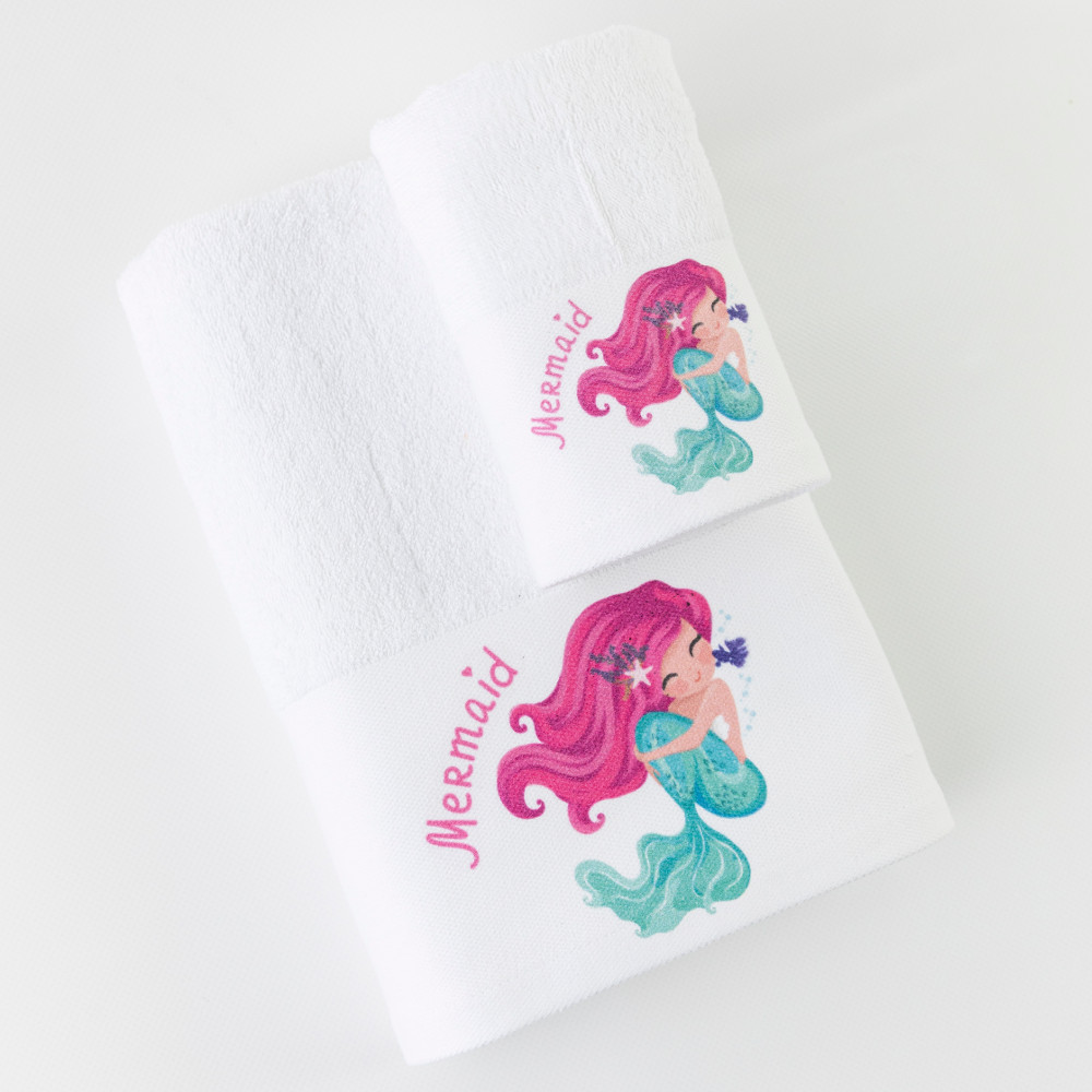 Σετ πετσέτες 2 τεμαχίων, μπάνιου και χειρός, από ύφασμα φροτέ πενιέ, 100% βαμβακερό, μονόχρωμο, λευκό, με ψηφιακή εκτύπωση, σχέδιο mergirl.Διατίθεται σε 2 χρώματα.