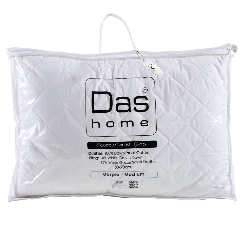 Μαξιλάρι Das home μέτριας σκληρότητας σε διάσταση 50Χ70εκ. Το κάλυμμα του είναι από 100% υποαλλεργικό βαμβάκι, ειδικά επεξεργασμένο για την συγκράτηση του υλικού γεμίσματος, ενώ το εσωτερικό του αποτελείται από 10% πούπουλο νεοσσού χήνας και 90% φτεράκι. Ιδιαίτερα απαλό και ανθεκτικό στη χρήση. Das home…makes your house a home!