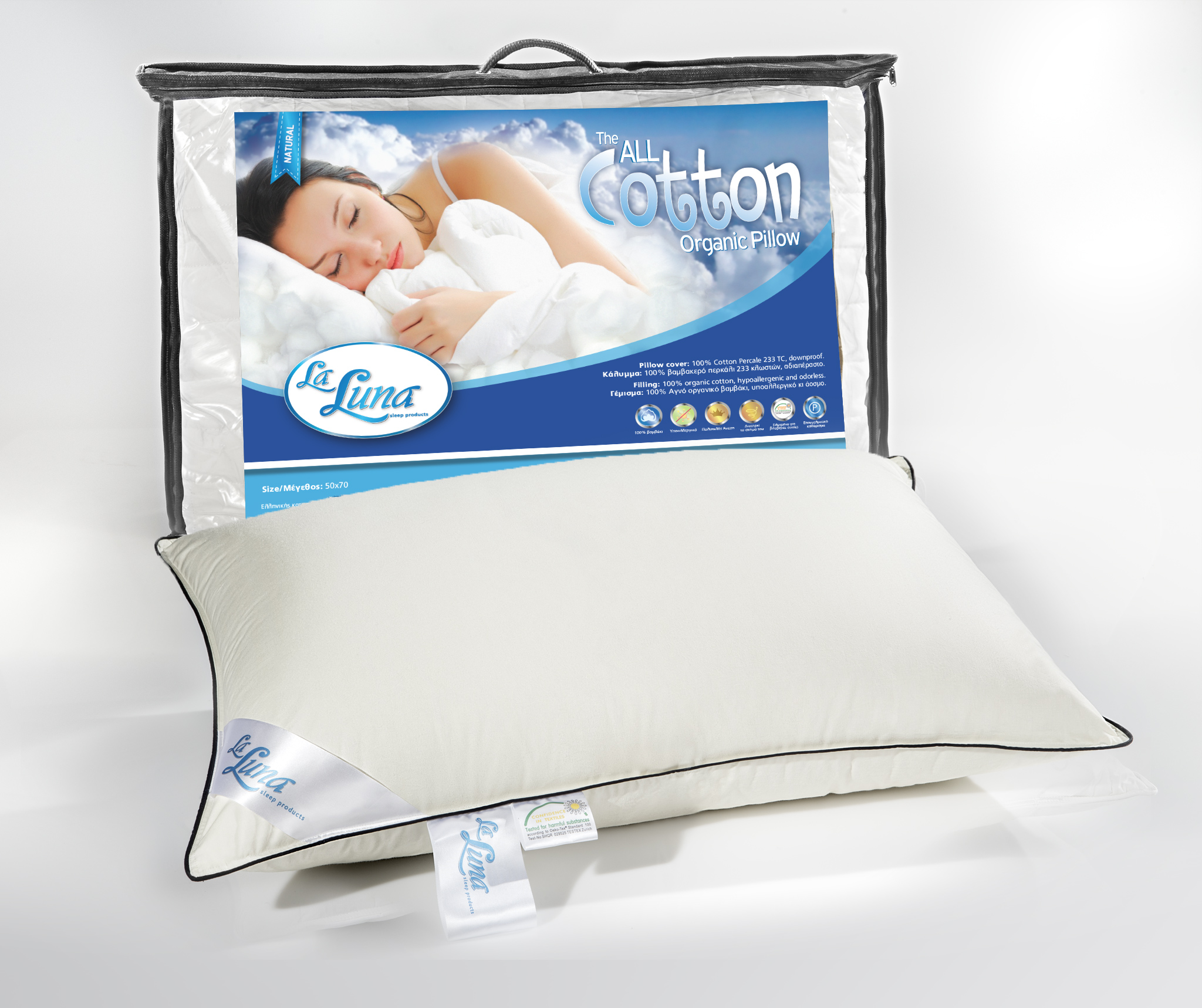 Μαξιλάρι γεμισμένο με αρίστης ποιότητας οργανικό αγνό βαμβάκι πενιέ.